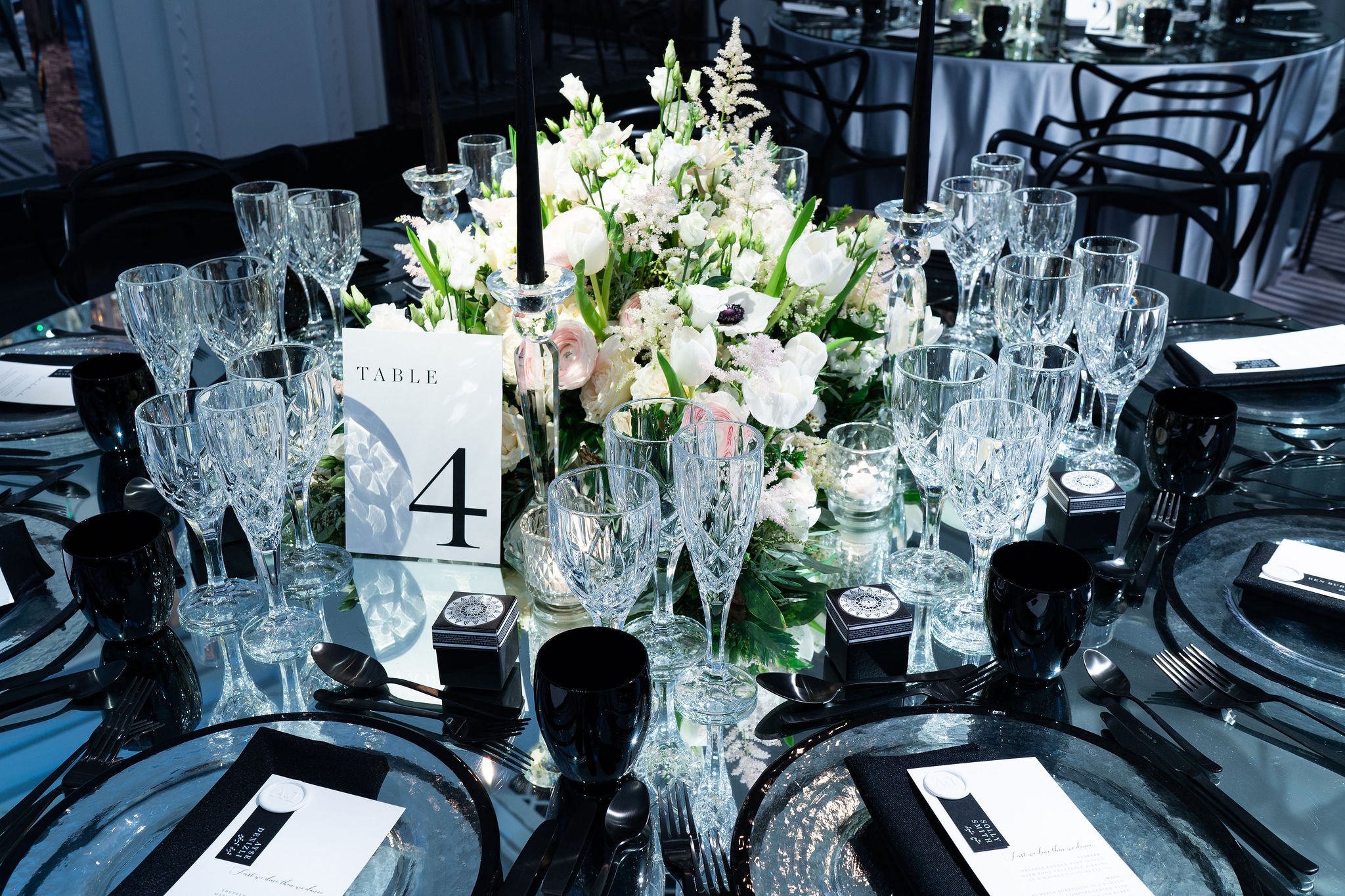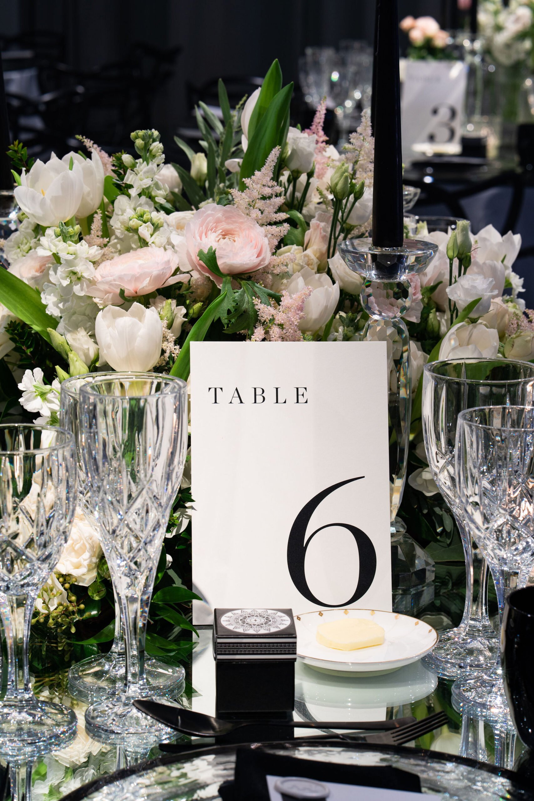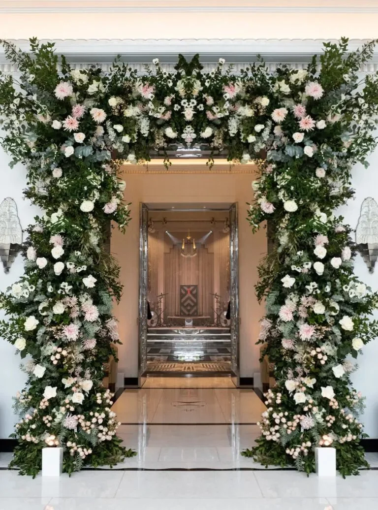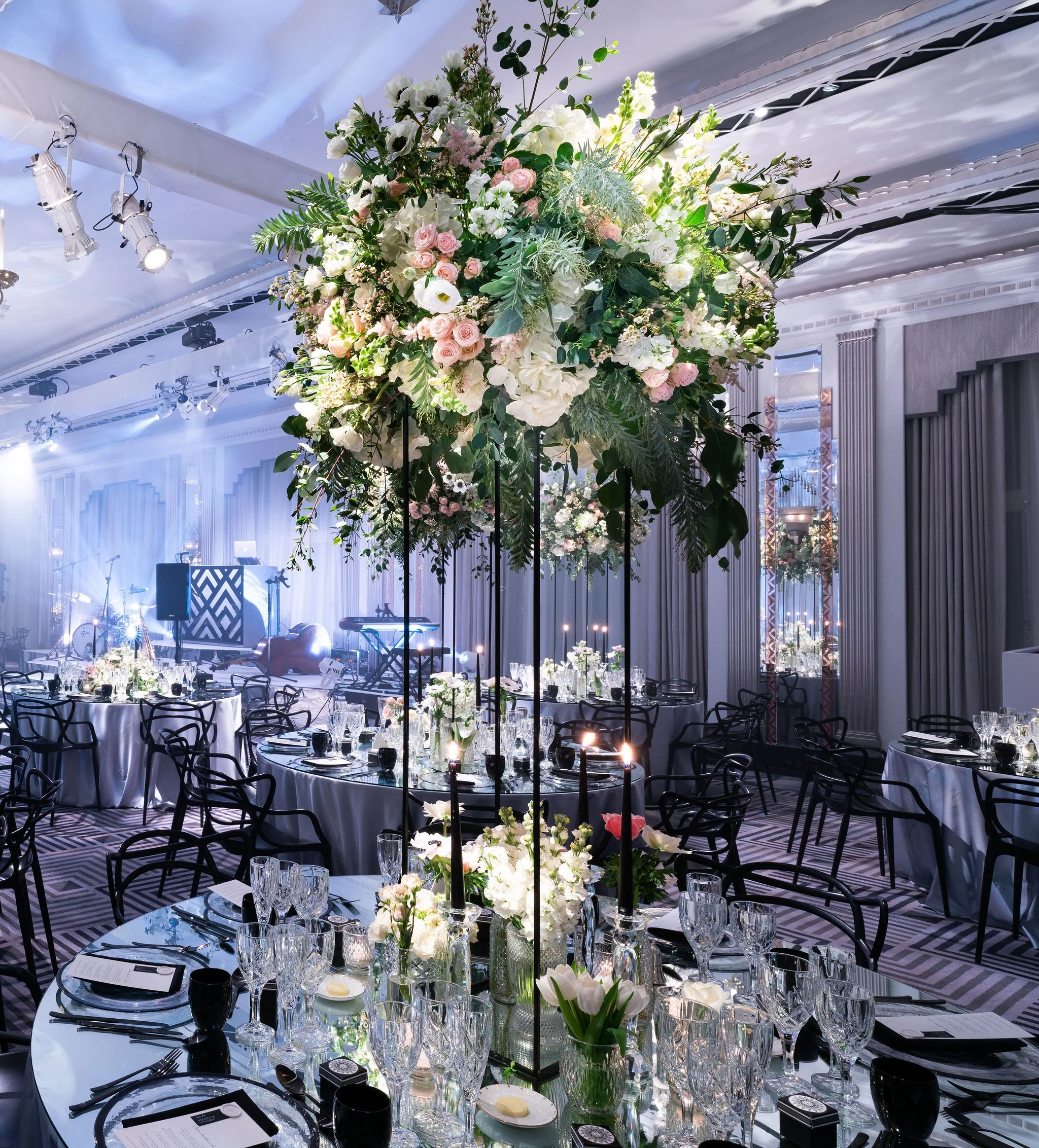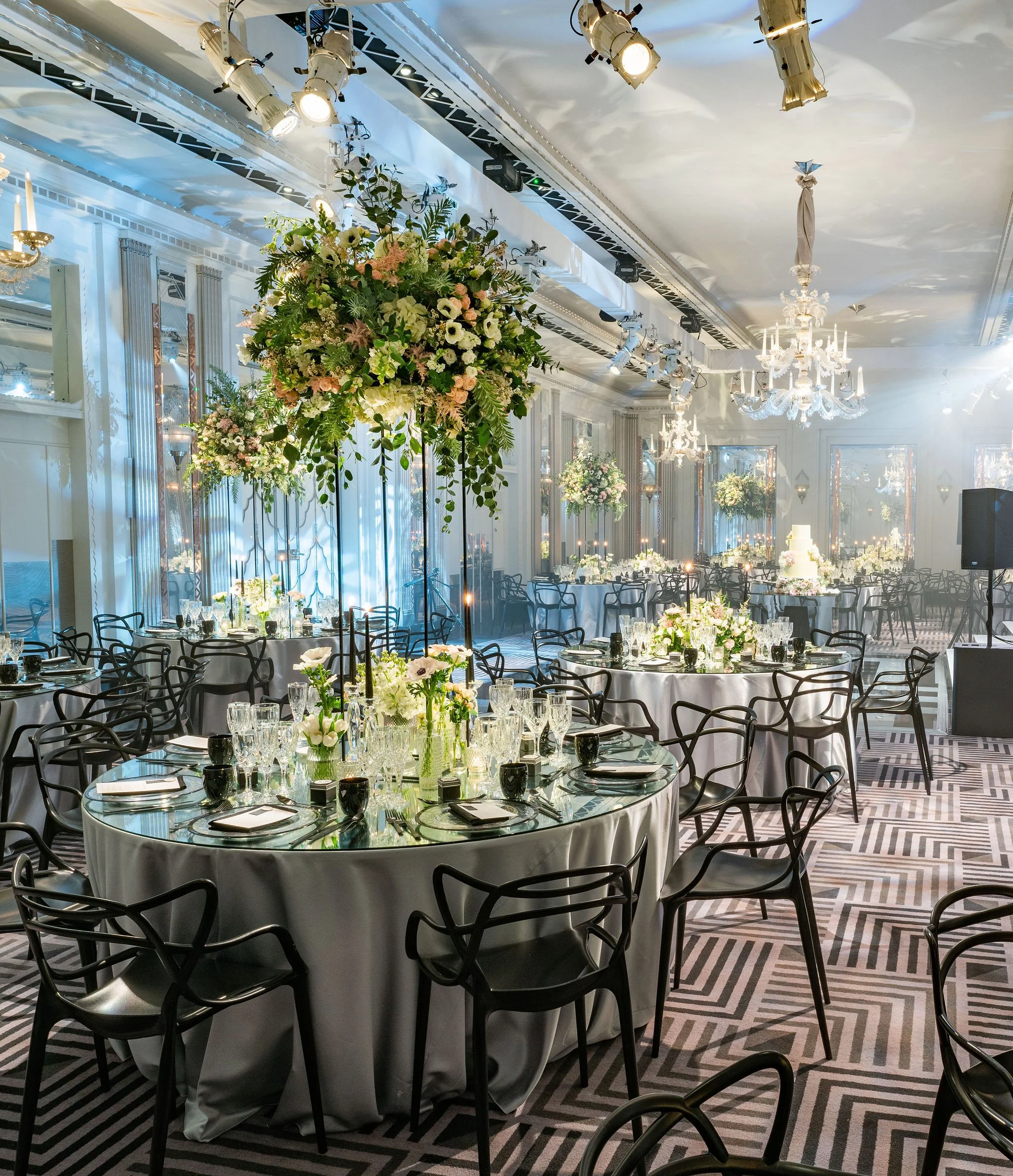 A striking black-and-white colour palette led the way for this beautiful wedding at Claridge’s but was softened with green, white and blush pink florals creating a modern and elegant setting.