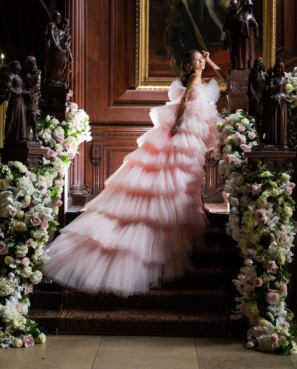 Kiko wore three bespoke and hand-crafted gowns by Italian designer Giambattista Valli. The celebration was brought to life with an eight-piece show band, ten-tier cake, bespoke perfume for each guest, fireworks, and an immersive edible fragrance experience. This extraordinary wedding was later featured in the Channel 4 documentary A Very British Country House.