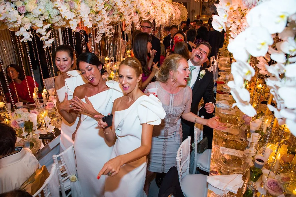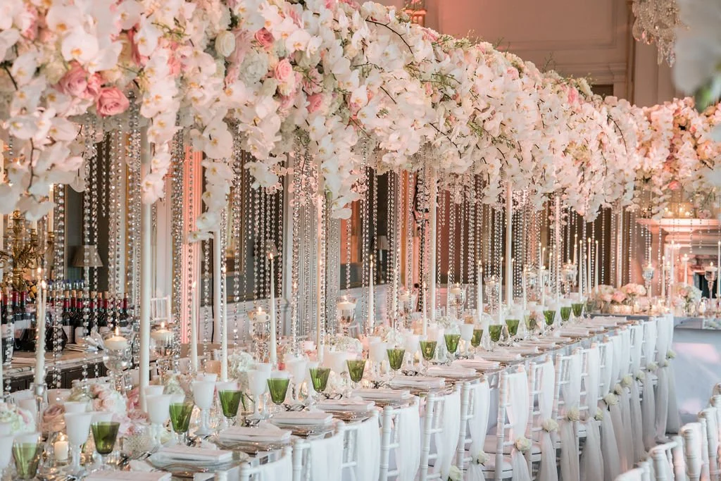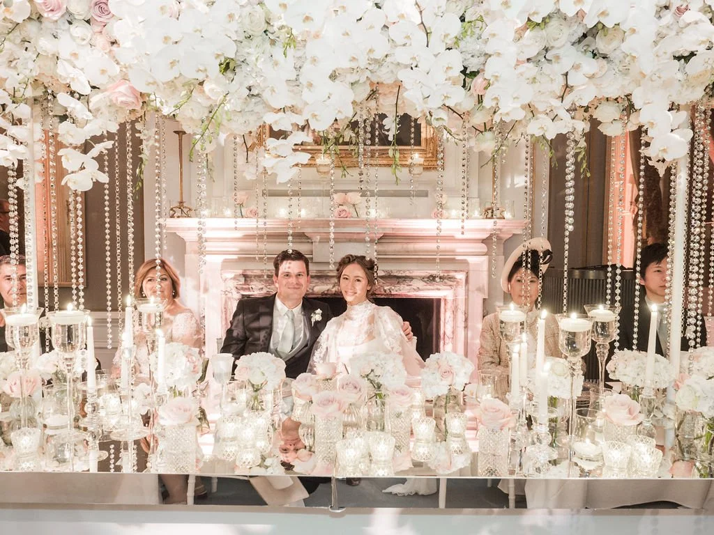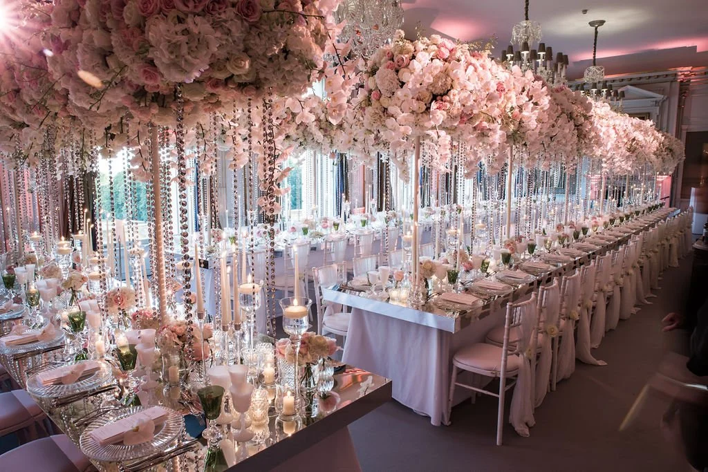Kiko and Carl entrusted us with creating a fairytale wedding at the historic Cliveden House in Berkshire. Their reception featured tables dressed with a dramatic floating floral canopy, cascading crystals, and bespoke mirrored tabletops that reflected the light beautifully.