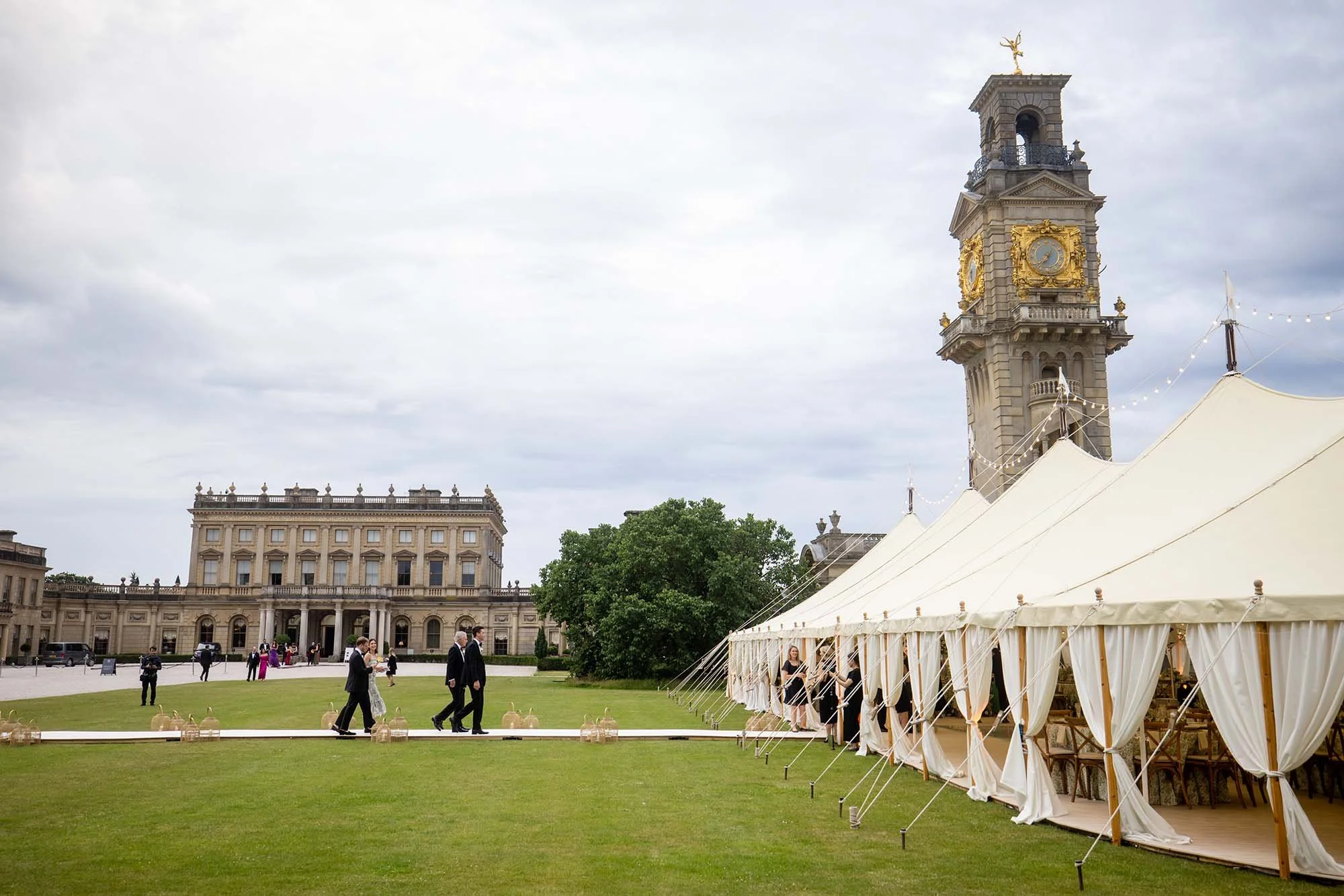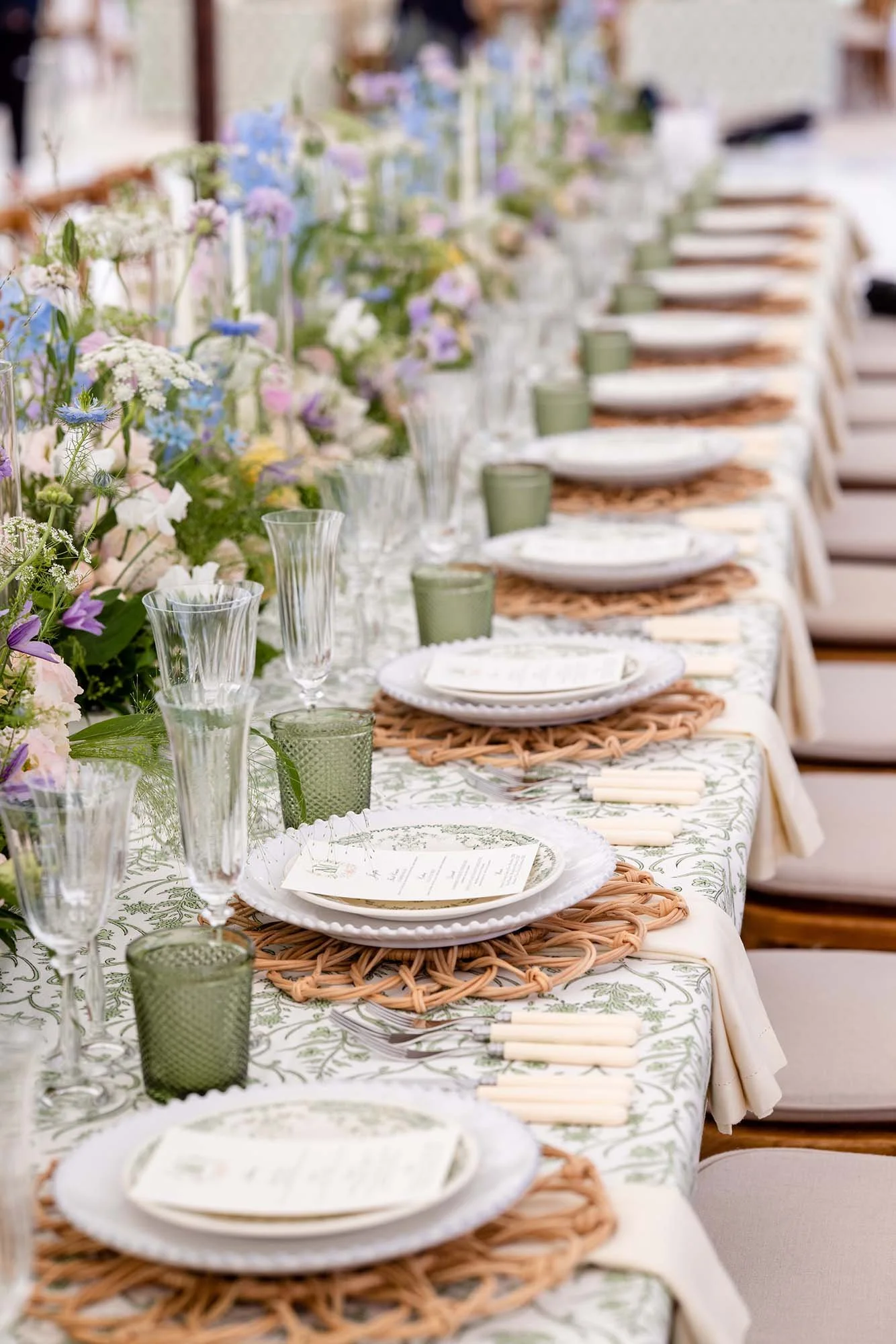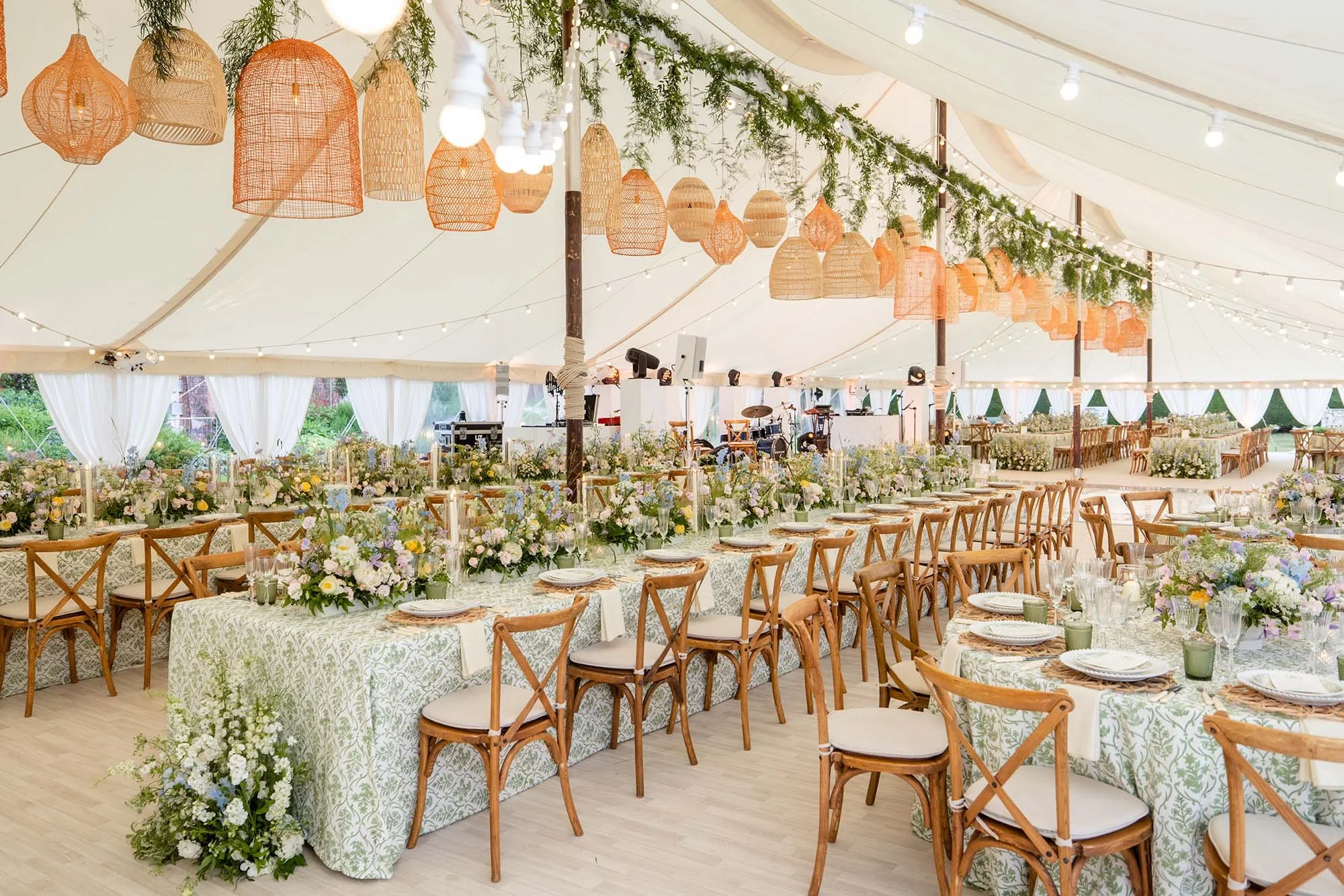 Set within the grounds of Cliveden House, this countryside marquee wedding was defined by an understated palette of soft greens and crisp whites with pops of pastel blue and yellow, creating a look that felt both elegant and naturally refined.