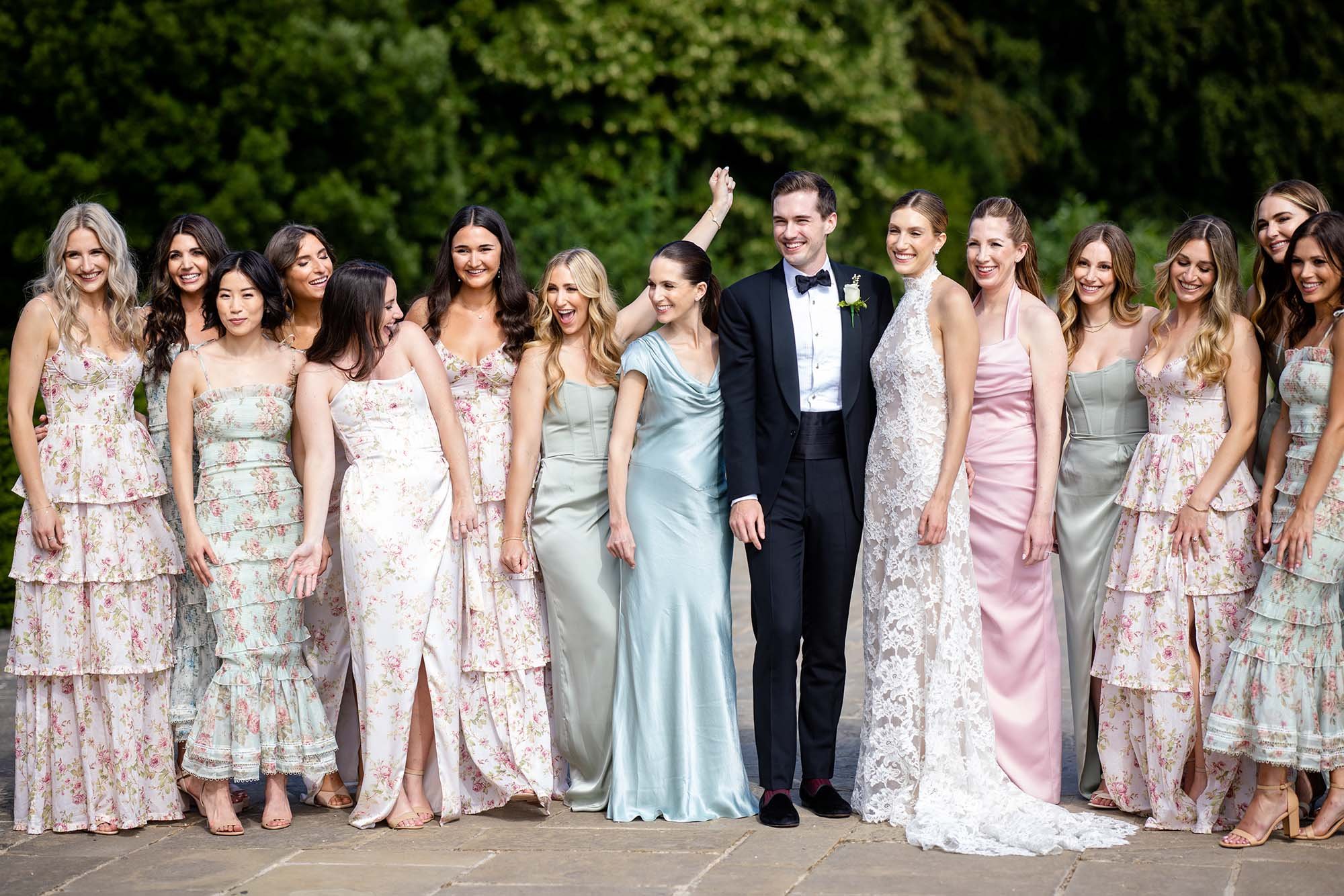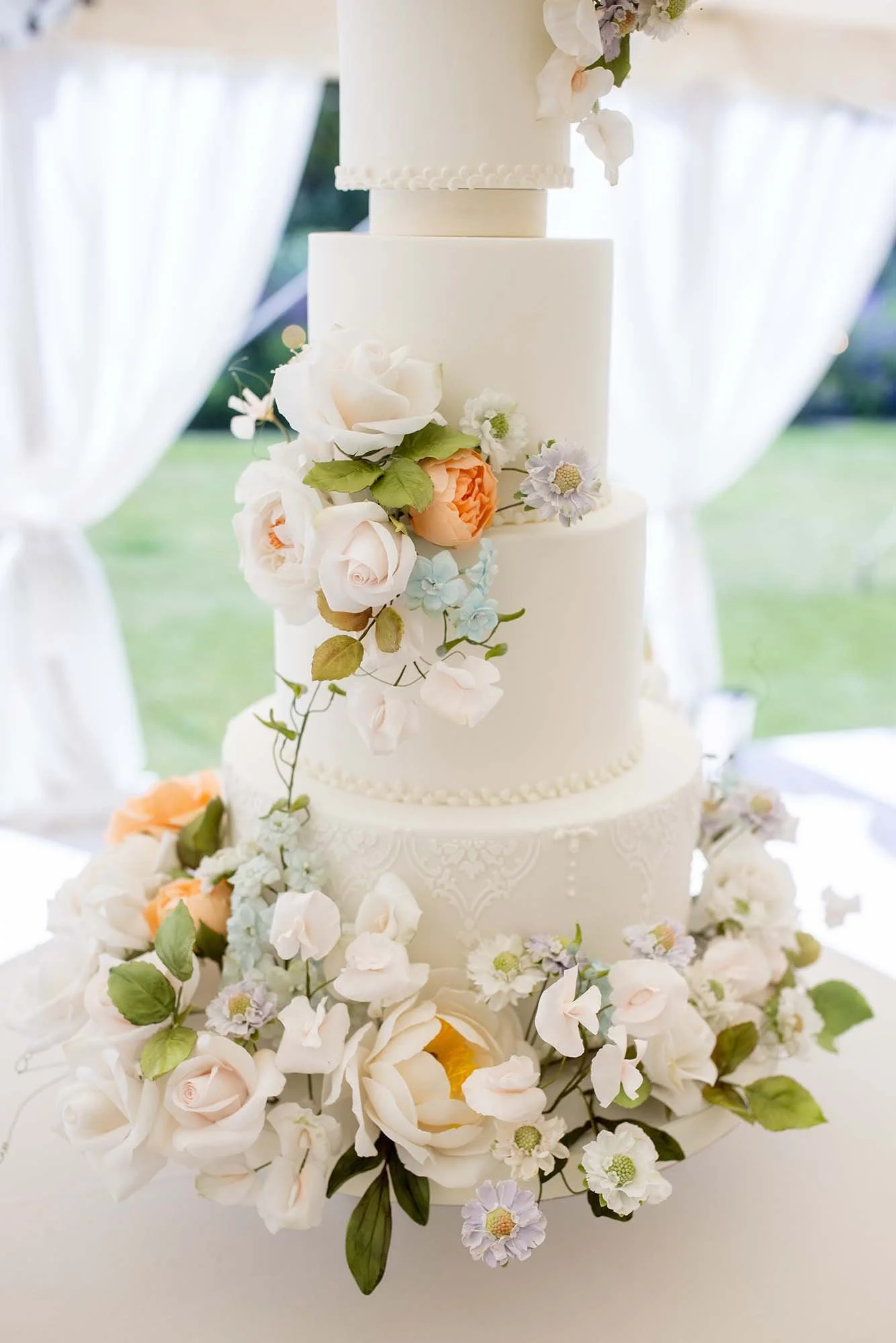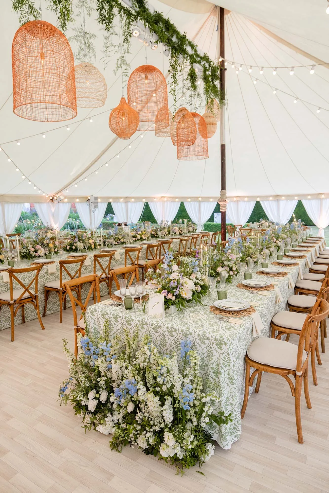 Set within the grounds of Cliveden House, this countryside marquee wedding was defined by an understated palette of soft greens and crisp whites with pops of pastel blue and yellow, creating a look that felt both elegant and naturally refined.