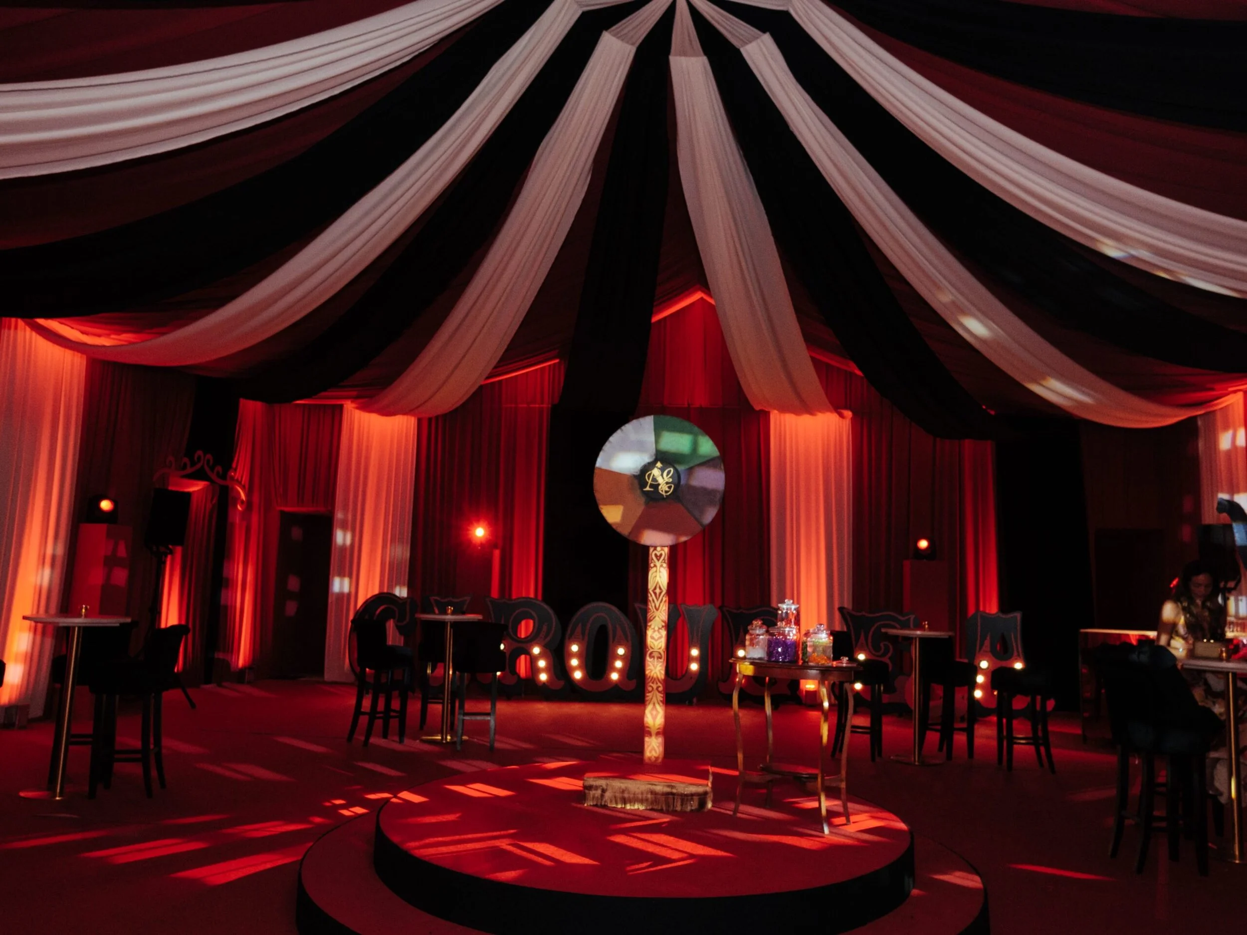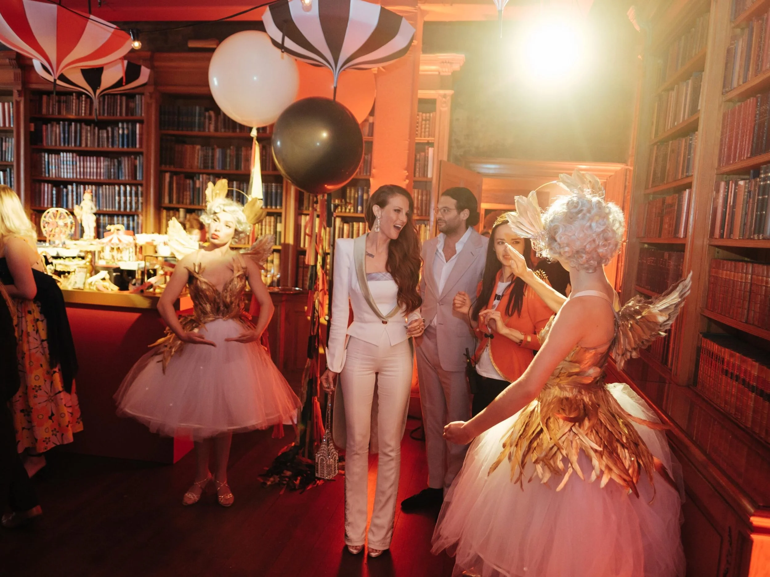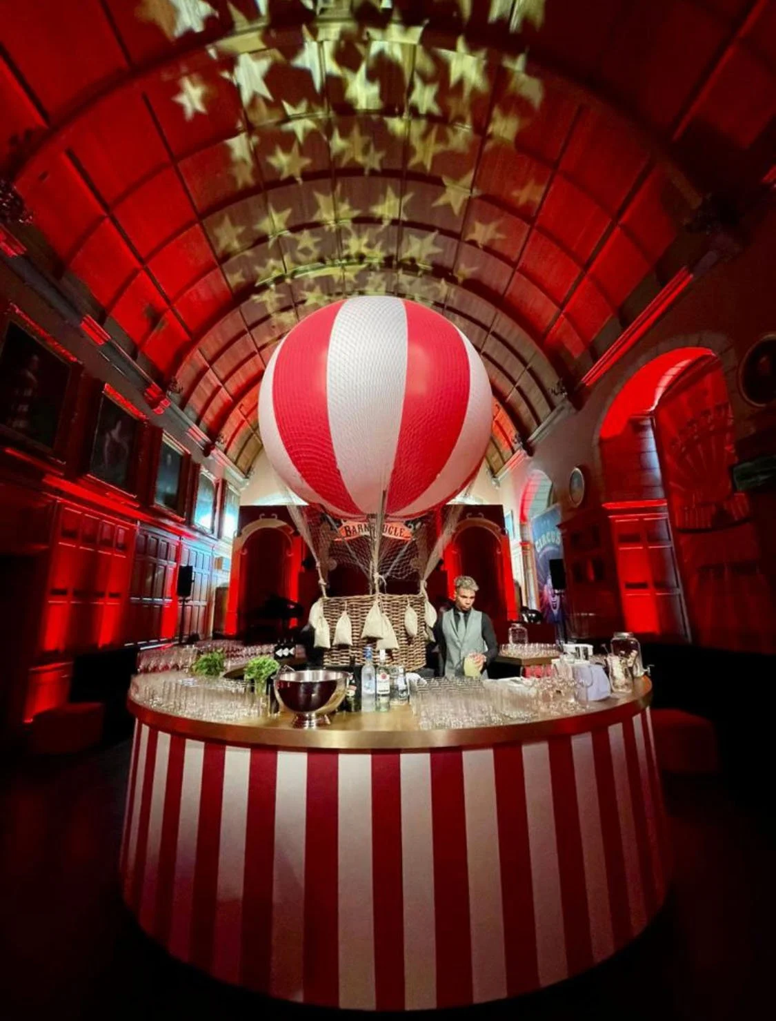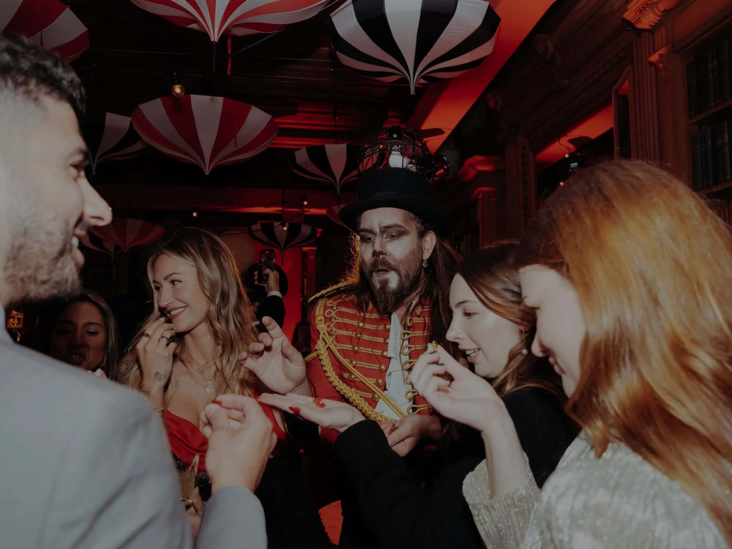 Guests were welcomed by a ringmaster, roaring lions, acrobats, and fire jugglers before stepping into spaces styled with hanging vintage parasols, festoon lighting, and a dramatic hot-air-balloon bar. Darker, theatrical elements — including headless clowns, Siamese-twin fortune tellers, and ghostly projections — awaited in the upper rooms, creating an unforgettable event that guests described as unlike anything they had seen before.