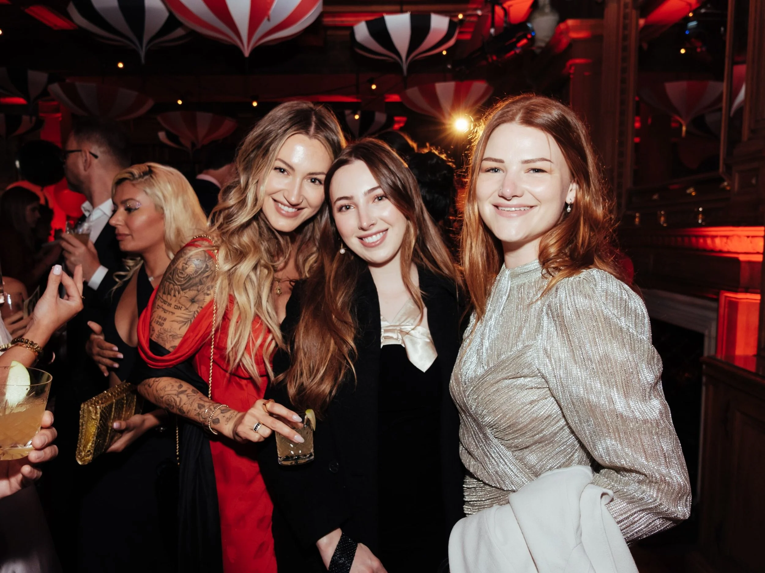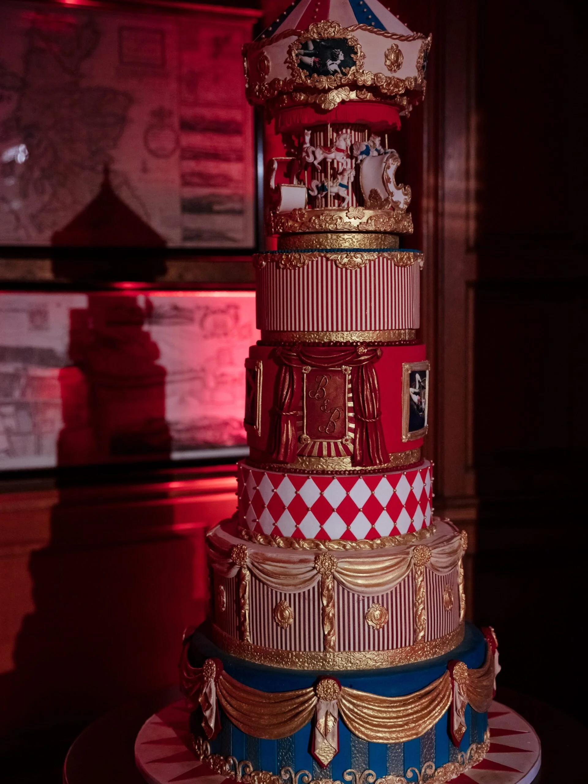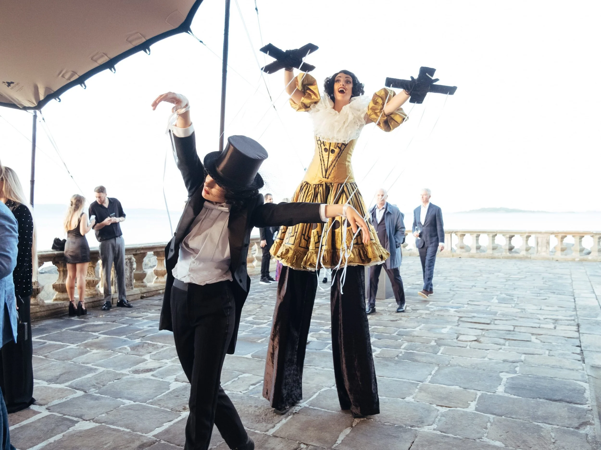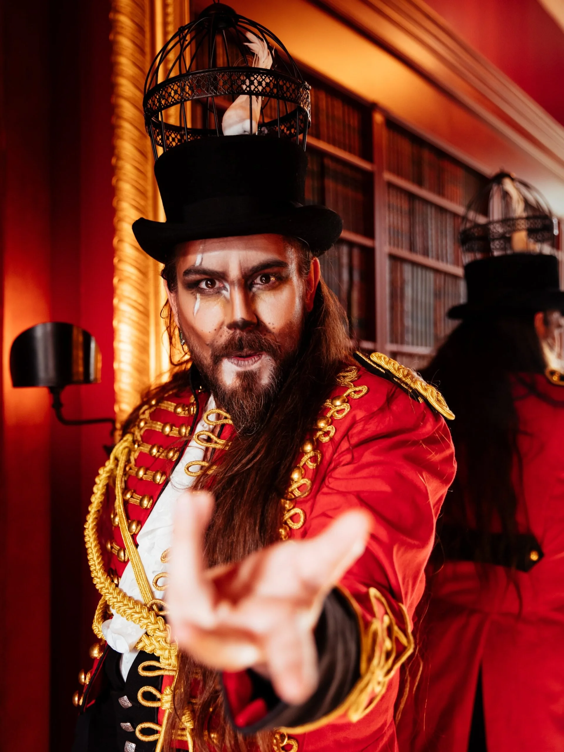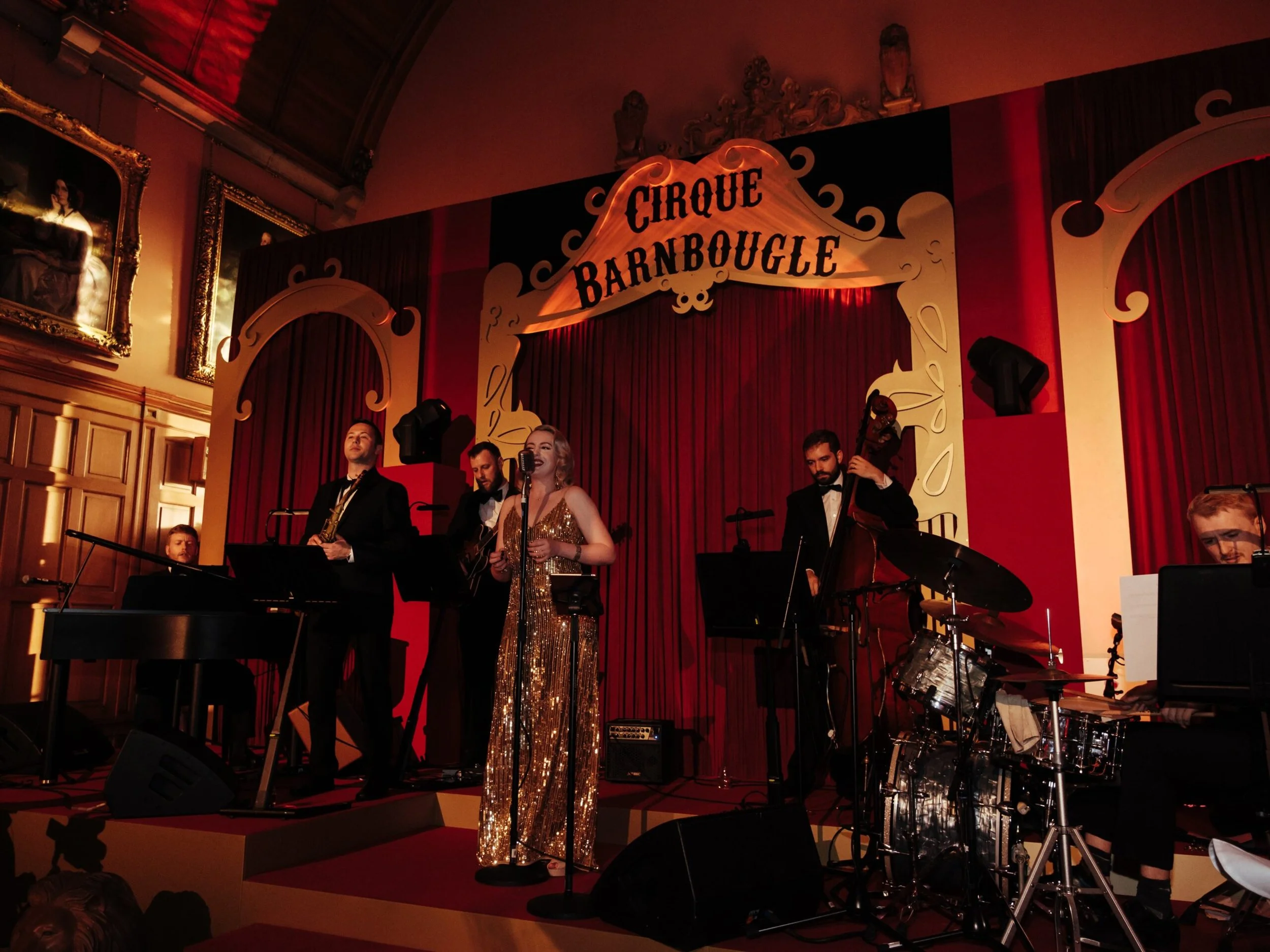 Guests were welcomed by a ringmaster, roaring lions, acrobats, and fire jugglers before stepping into spaces styled with hanging vintage parasols, festoon lighting, and a dramatic hot-air-balloon bar. Darker, theatrical elements — including headless clowns, Siamese-twin fortune tellers, and ghostly projections — awaited in the upper rooms, creating an unforgettable event that guests described as unlike anything they had seen before.